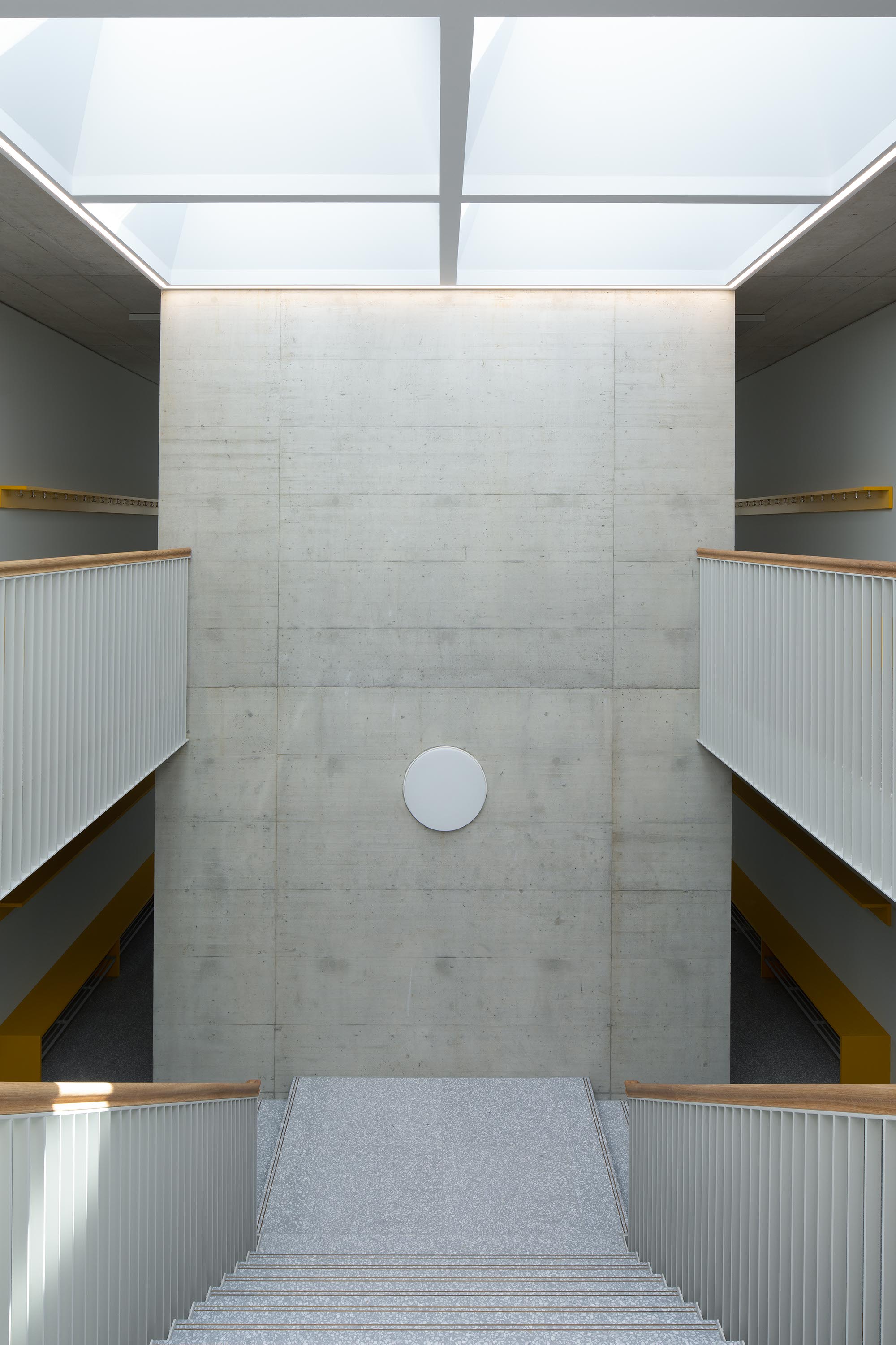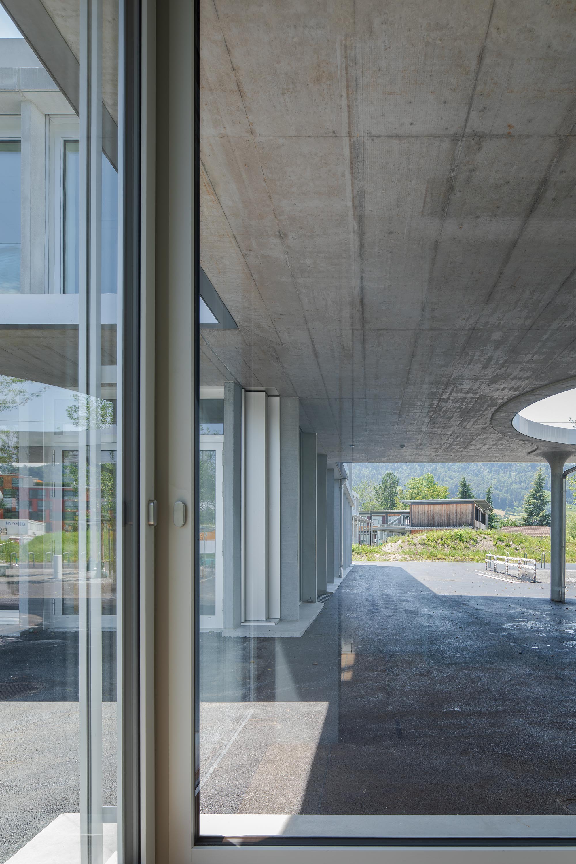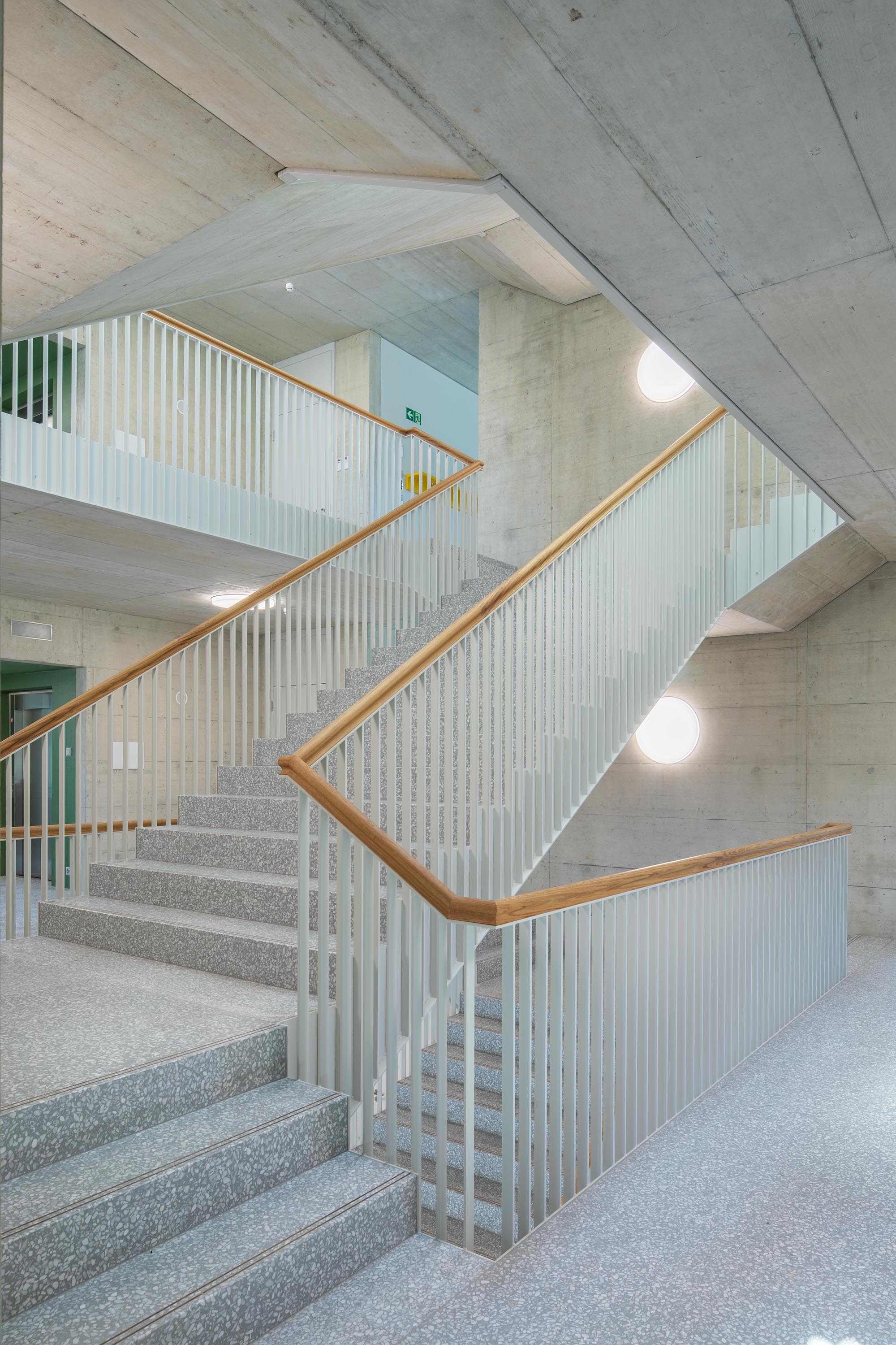 Das Projekt sieht drei unterschiedlich hohe, versetzt zueinander stehende Baukörper vor, die in vergleichbaren Grundabmessungen und architektonischem Ausdruck eine pavillonartige Campusanlage bilden. Jeder Gebäudekörper hat eine andere Betriebsfunktion: Schule, Mehrzweck oder Tagesstruktur mit Kindergarten. Aussen- und Sportflächen bilden eine Aussenanlage mit Durchwegung auf mehreren Wegeführungen. Der Hauptzugang zu den Gebäuden erfolgt über einen gemeinsamen gedeckten Vorplatz.